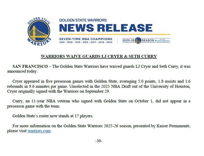 北京時間10月19日,勇士隊發(fā)布官方公告,宣布裁掉塞斯-庫里和LJ-克萊爾。