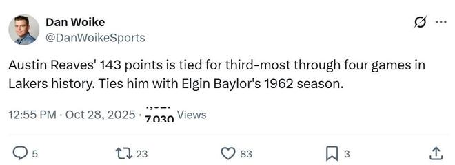 憑借這樣的表現(xiàn),里夫斯前四場(chǎng)總得分追平埃爾金-貝勒在1962賽季創(chuàng)下的隊(duì)史第三高紀(jì)錄,僅次于科比的146分和杰里-韋斯特的154分。