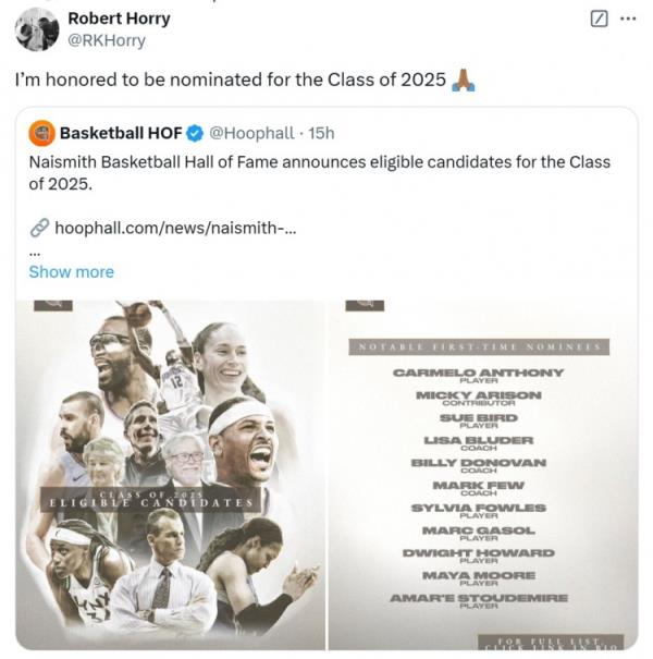 其中,七冠成員羅伯特-霍里在列。對此,他轉(zhuǎn)推評論道:“我很榮幸能夠提名2025屆奈史密斯名人堂?!?/p>