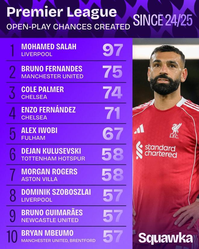 據(jù)數(shù)據(jù)網(wǎng)站Squawka統(tǒng)計(jì),自2024-25賽季以來,薩拉赫是英超運(yùn)動戰(zhàn)創(chuàng)造機(jī)會次數(shù)最多的球員,布魯諾-費(fèi)爾南德斯排名第二。